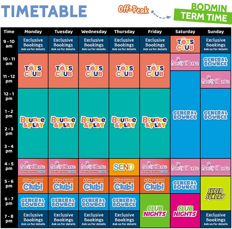 We’re open 7 days a week. Sessions change during peak and off-peak times so please check our timetable of activities before travelling.