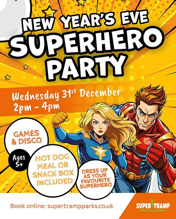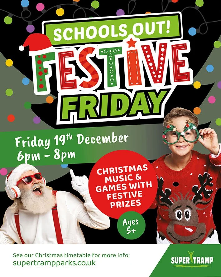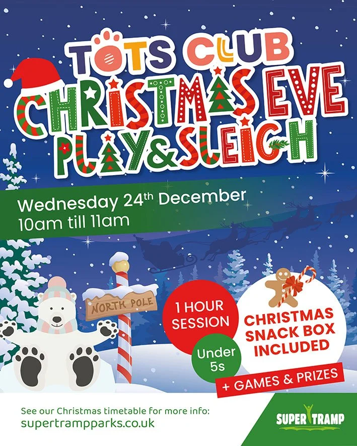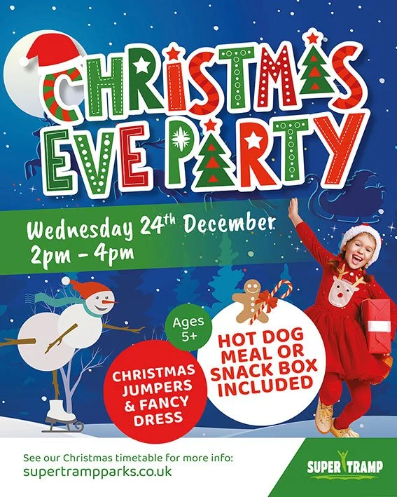 Get ready for Christmas at our Christmas Eve Party on Wednesday 24th December from 2pm - 4pm. Wear your Christmas jumper, or festive fancy dress and join in the fun. Available at all Super Tramp Parks, suitable for over 5’s.
