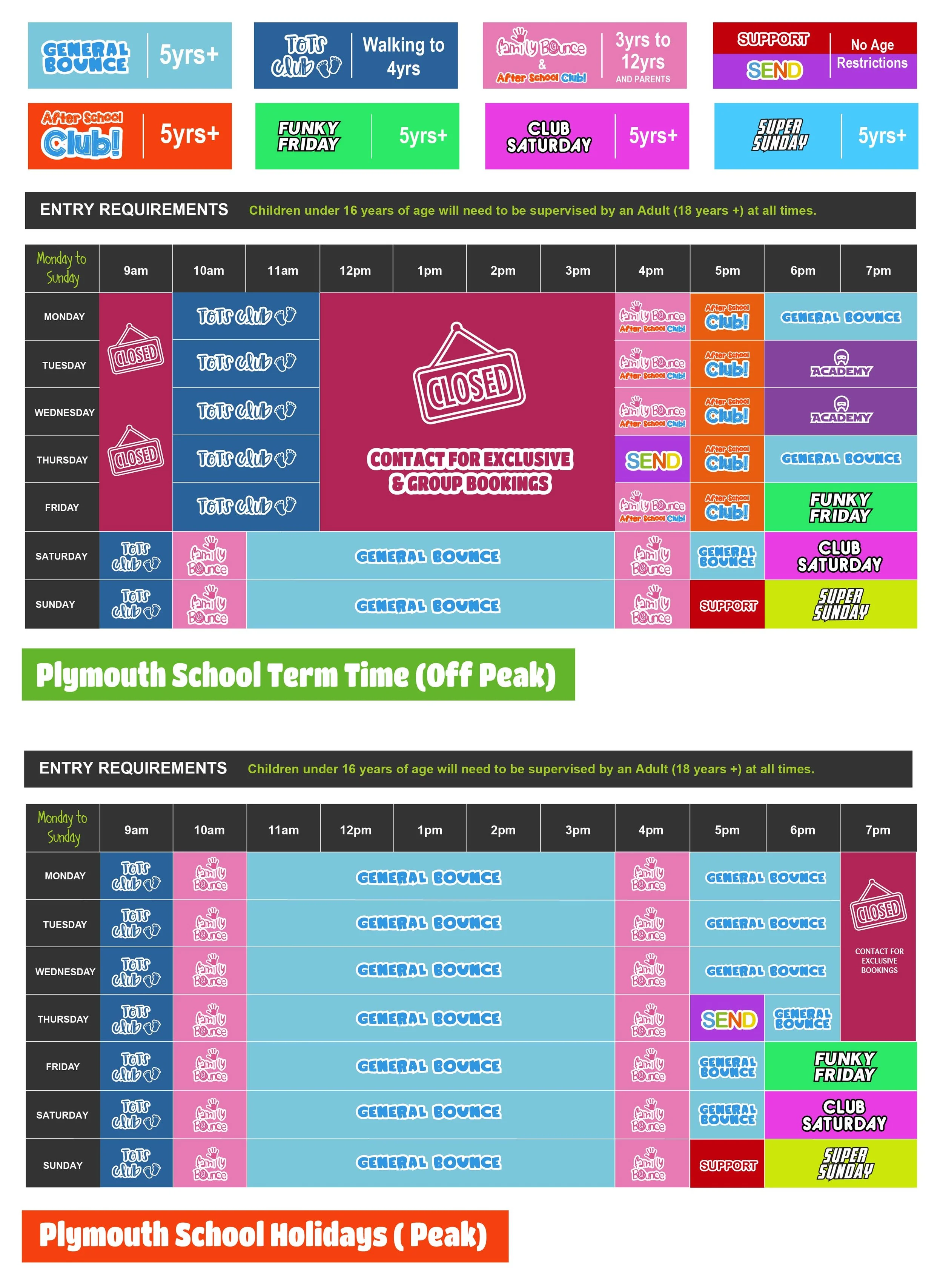 All bouncers must hold a valid waiver. If you are under 16 the waiver must be completed by a parent or guardian on site. You must be 5 years or older to bounce in General Bounce sessions.