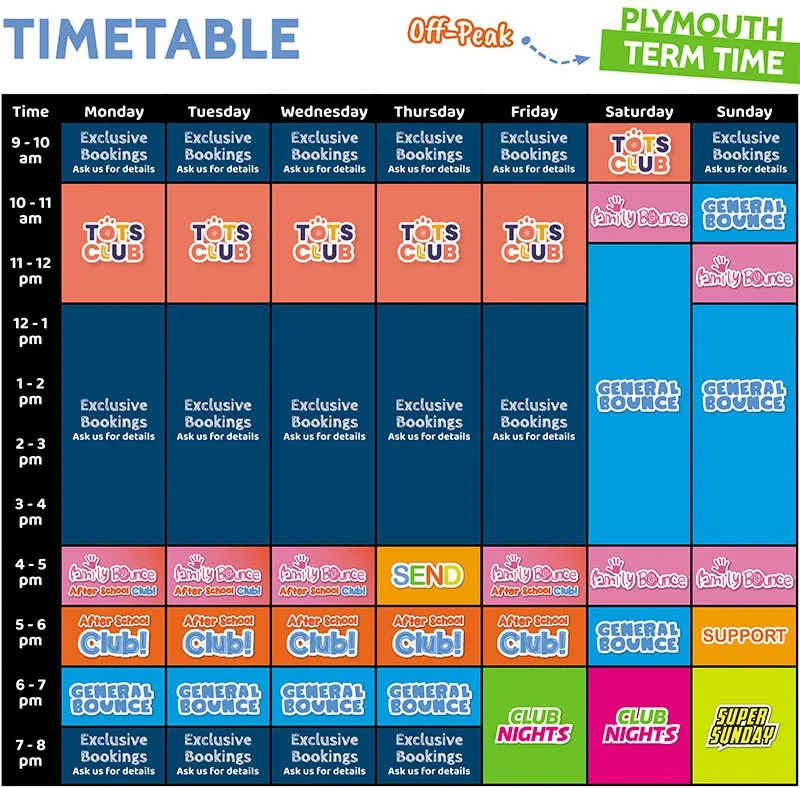We’re open 7 days a week. Sessions change during peak and off-peak times so please check our timetable of activities before travelling.